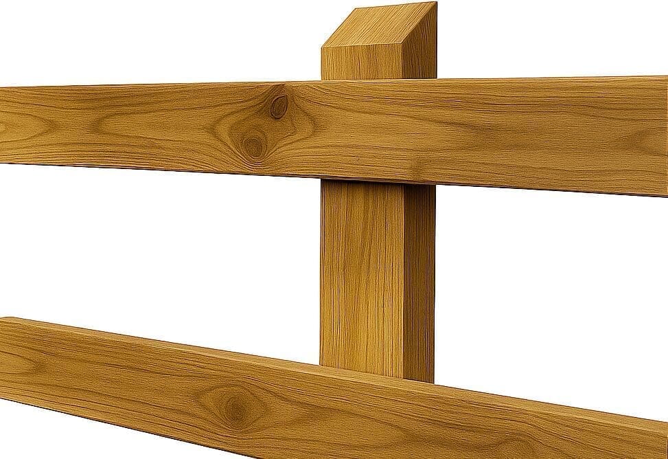 Clôture Budget Chêne pour pâturage. Fabriquée à partir de poteaux et de poutres en chêne massif, cette clôture offre une protection naturelle aux chevaux, poneys, bovins, moutons, alpagas et autres animaux, et s’intègre parfaitement à tous les environnements. environnement rural.